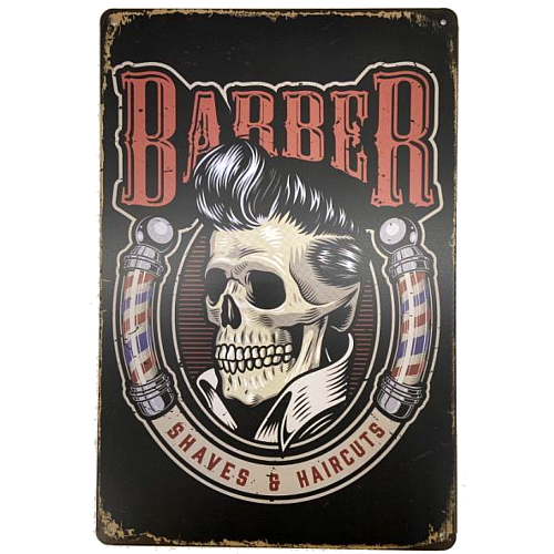 Plaque déco en métal 30×20 Barber avec crane + coiffure banane